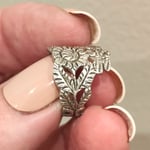 This delicate sterling silver ring has been lovingly upcycled from a vintage brooch, transforming a forgotten piece into a miniature work of art. A finely detailed flower sits at the centre, surrounded by engraved leaves that curve gracefully around the band. Perched atop the bloom is a tiny bird — perhaps an eagle — adding a touch of whimsy and character. 🕊️